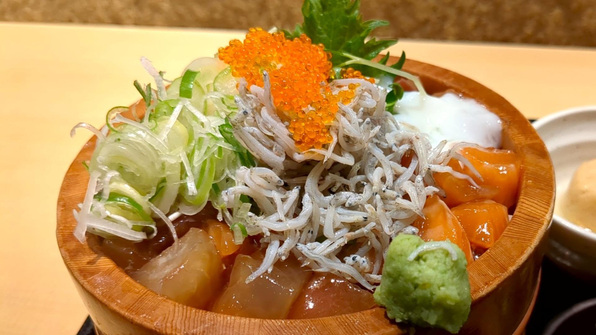 その上に、しらす・魚卵・温玉・かいわれ大根・ネギ・大葉が豪快にトッピングされ、まさに海の幸の宝石箱のよう。