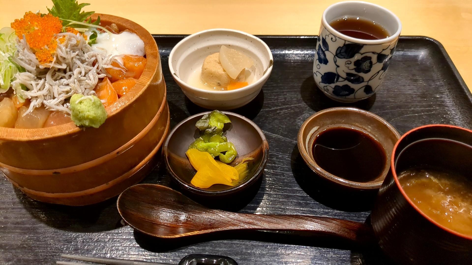 「厳選まかない海鮮丼」には、小鉢・赤だし・漬物がセットになっており、味のバランスも考えられています。