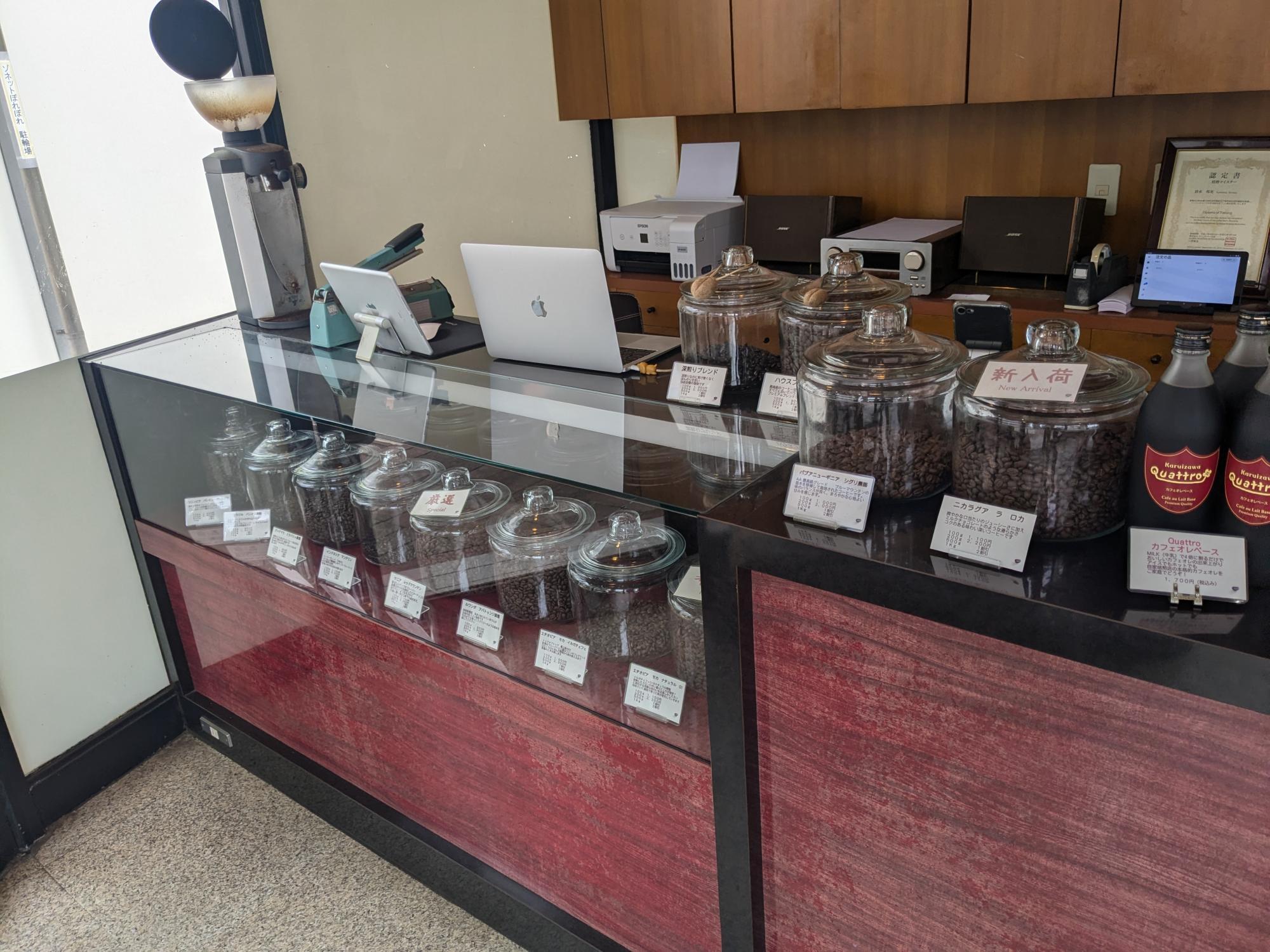 店内では、選りすぐりの自家焙煎コーヒー豆が販売されていました。