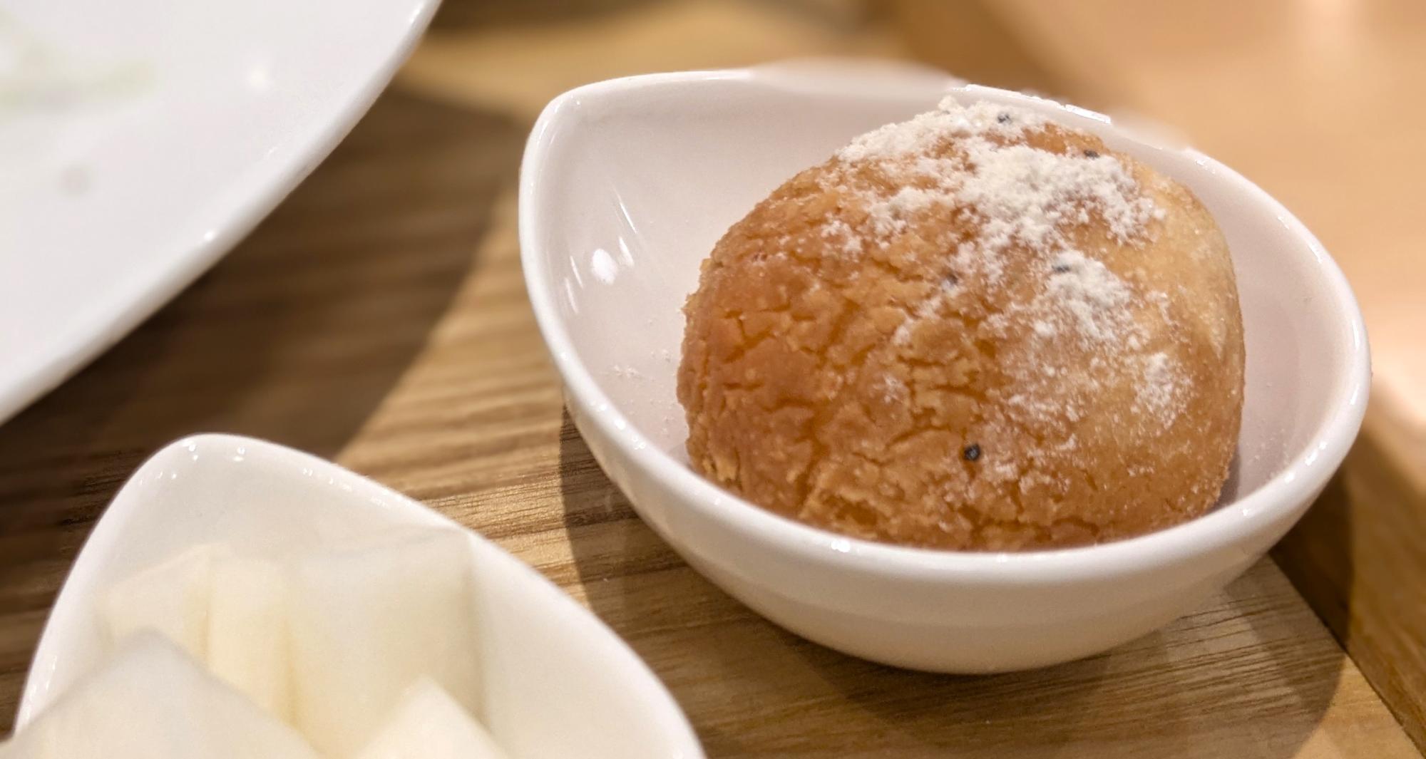 小鉢もついており、3種類(韓国チキン、チーズボール、半熟味付き玉子)の中からチーズボールを選びました。