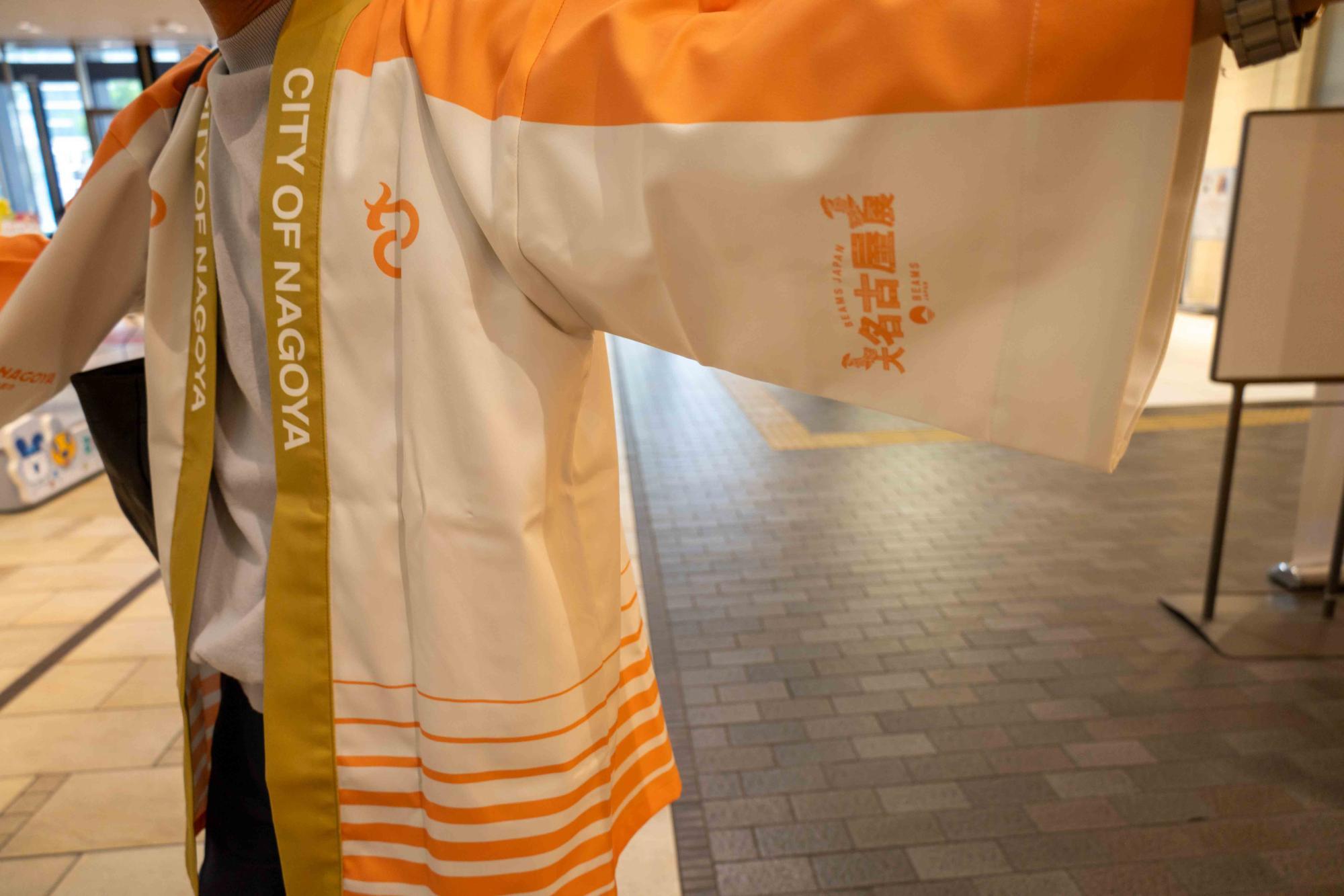 イベント用の公式法被を展示(非売品)。金鯱や市章モチーフで“名古屋らしさ”を表現。