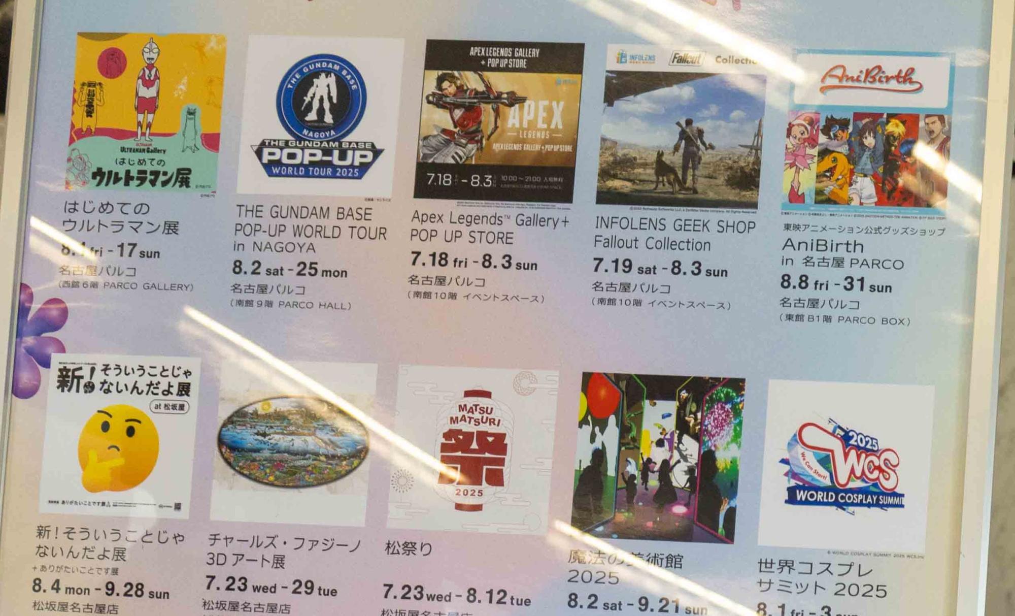 例えば、名古屋パルコでは「はじめてのウルトラマン展」や「THE GUNDAM BASE POP-UP WORLD TOUR」が、松坂屋では「劇場版ハイキュー!!」や「魔法の美術館」、でんきの科学館では「TVアニメ Dr.STONE×でんきの科学館コラボイベント」などが開催。