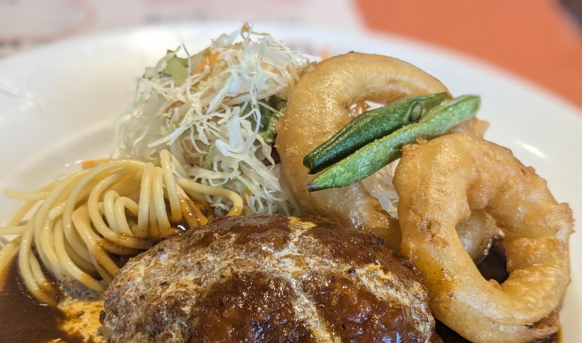 付け合せは、サラダ、オニオンリング、インゲンのフライ、パスタでした。