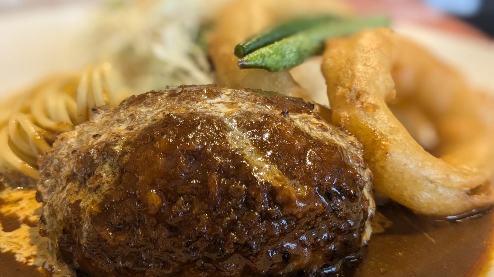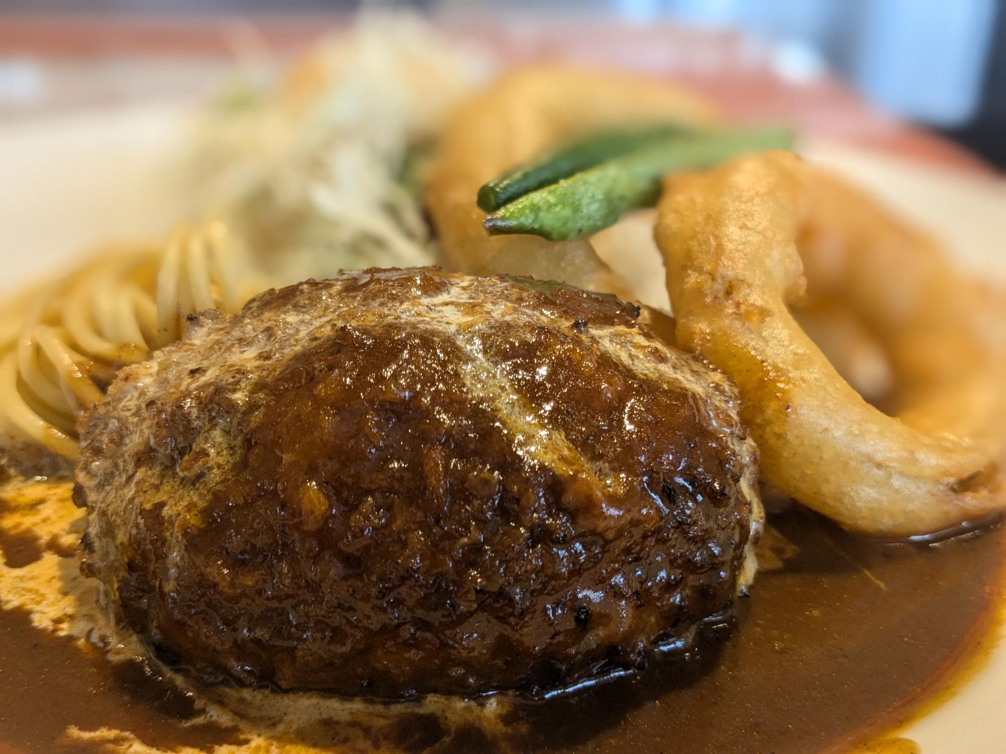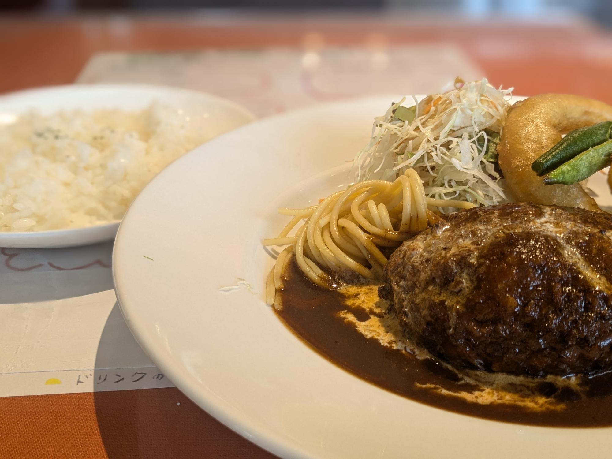 今回は、黒毛和牛ブレンドの牛肉100%のジューシーなハンバーグデミソースのランチセット(税込1,080円)を注文。