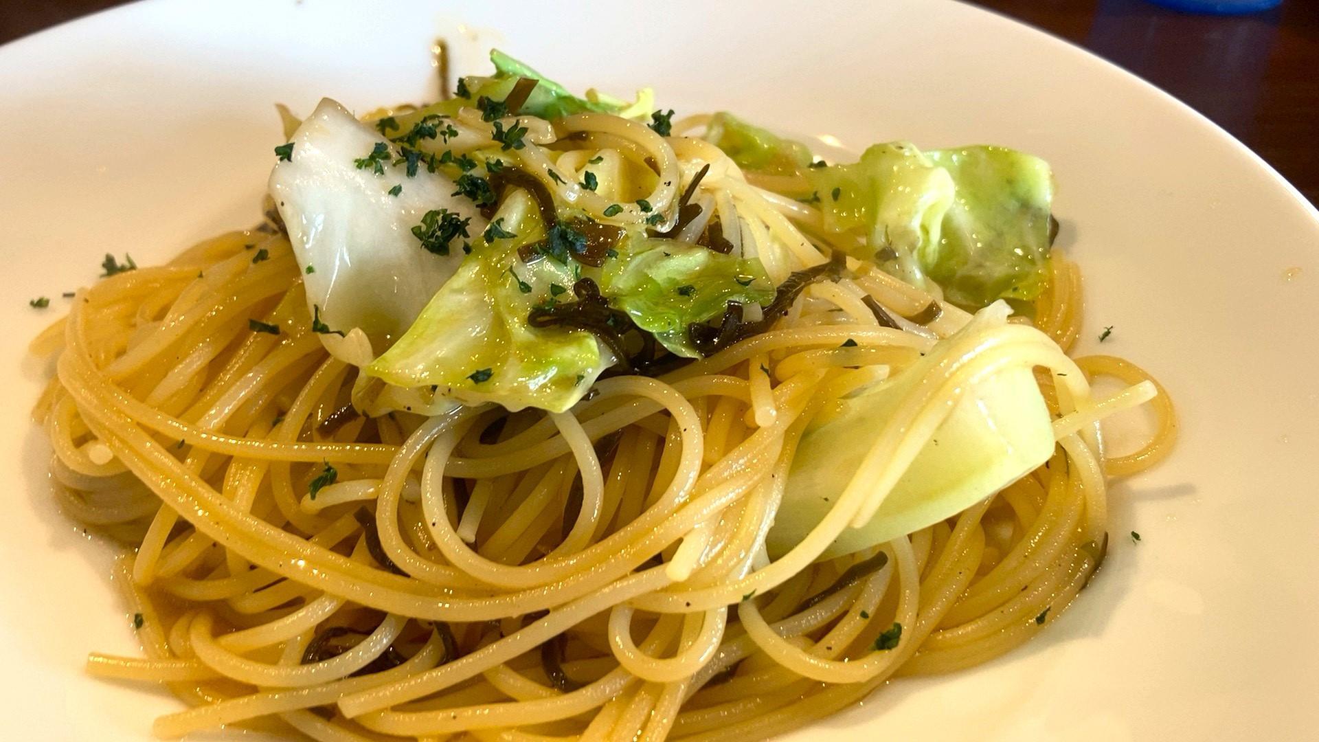 しばらくすると、キャベツと塩昆布のオイルソースパスタが運ばれてきました。