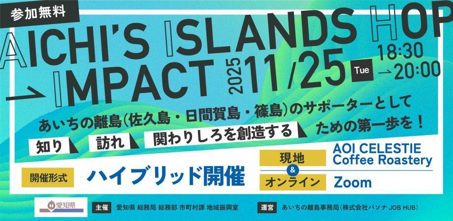 その3島を舞台に地域の未来を支える“サポーター(関係人口)”を育むプロジェクト説明会が、11月25日(火)に新栄町駅すぐの AOI CELESTIE Coffee Roastery(名古屋市東区東桜2-17-22)にて開催されます。