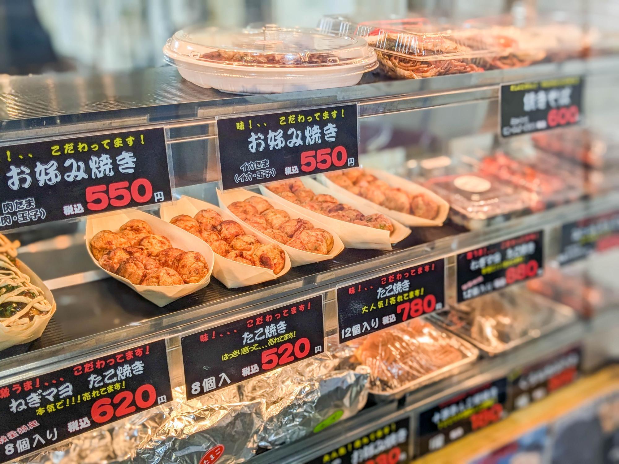 「八百屋たこ焼き壮」のたこ焼きの他にも、お好み焼き、焼きそば、たい焼きなどの豊富なメニューは、どれもこだわりが詰まっています。