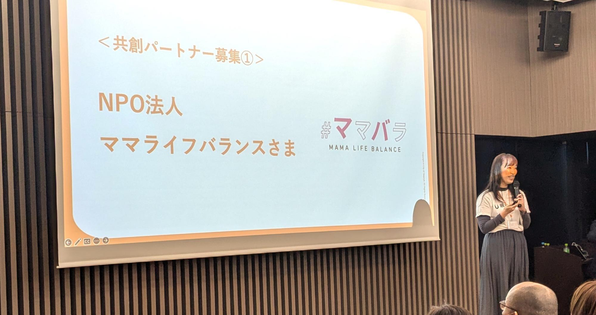 この中で、NPO法人ママライフバランスの上条さんは、子育てにまつわる社会課題をビジネスの視点で解決する取り組みを紹介しました。