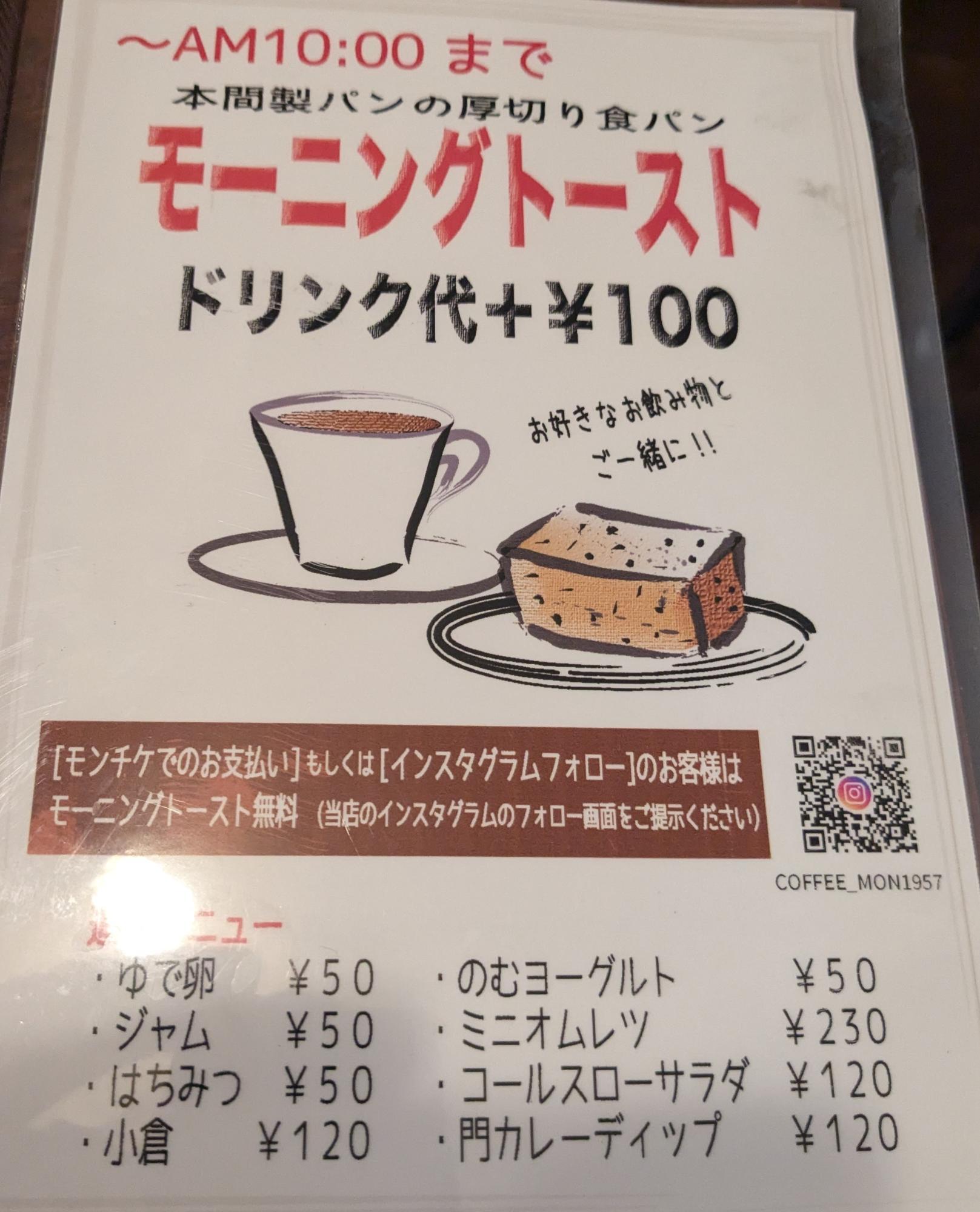 Instagramをフォローすると、モーニングトーストが無料になる嬉しいサービスも。公式Instagram【珈琲門】