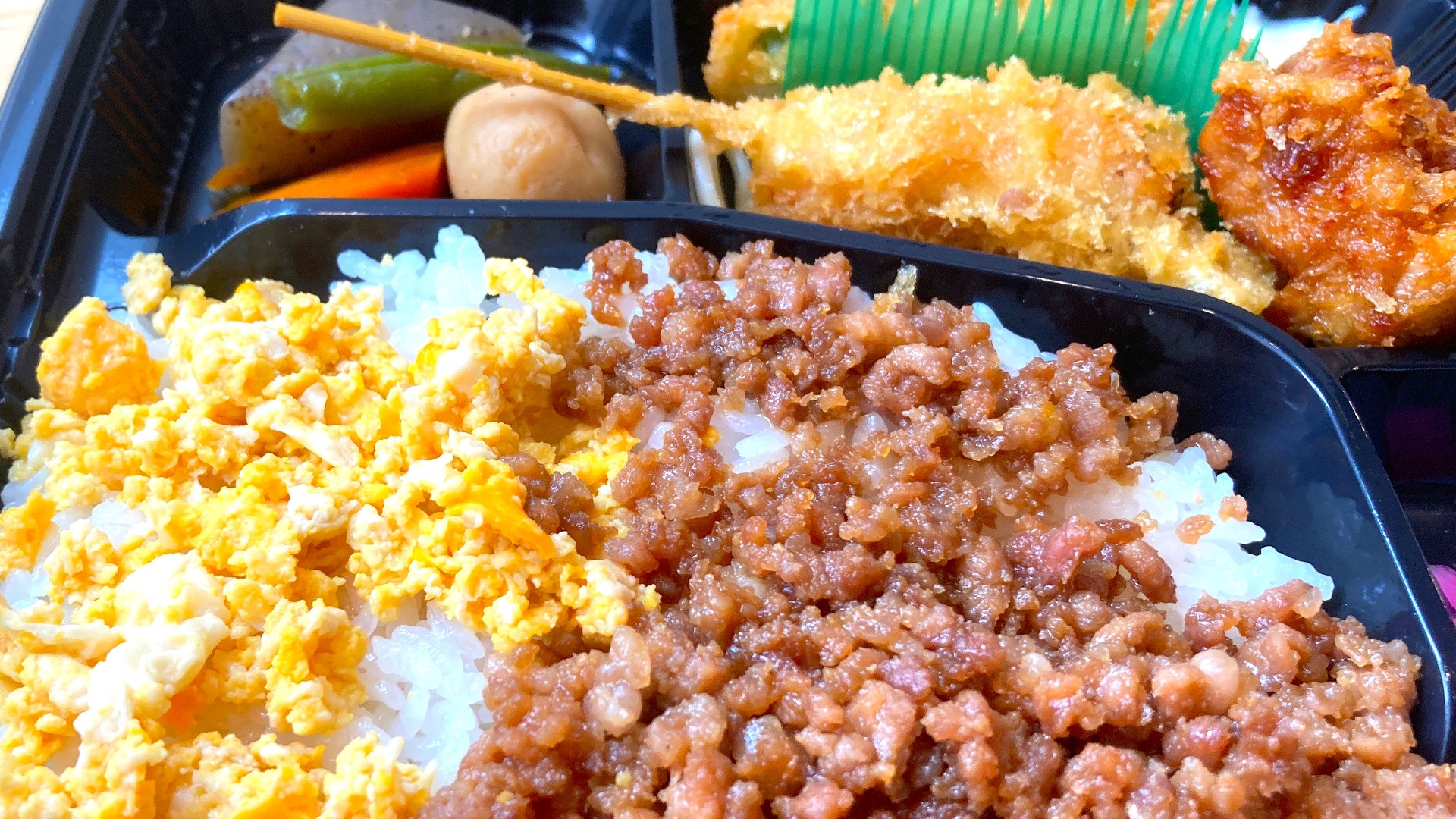 そして、少し甘めの卵が牛豚そぼろにマッチしていて、ごはんにとてもよく合います。