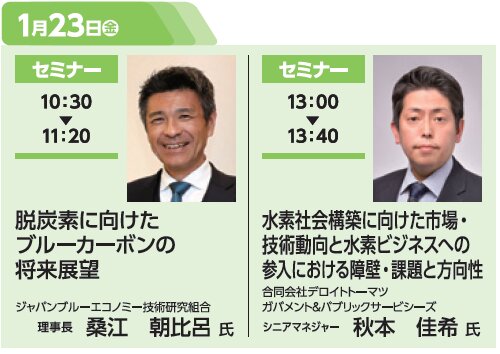 省エネ・省コスト化につながる設備・システムをはじめ、次世代電池として注目される全固体フッ化物イオン電池、ブルーカーボン生態系創出に向けた技術、廃棄物を再資源化する取り組みなど、幅広い分野の最新ソリューションが紹介されています。