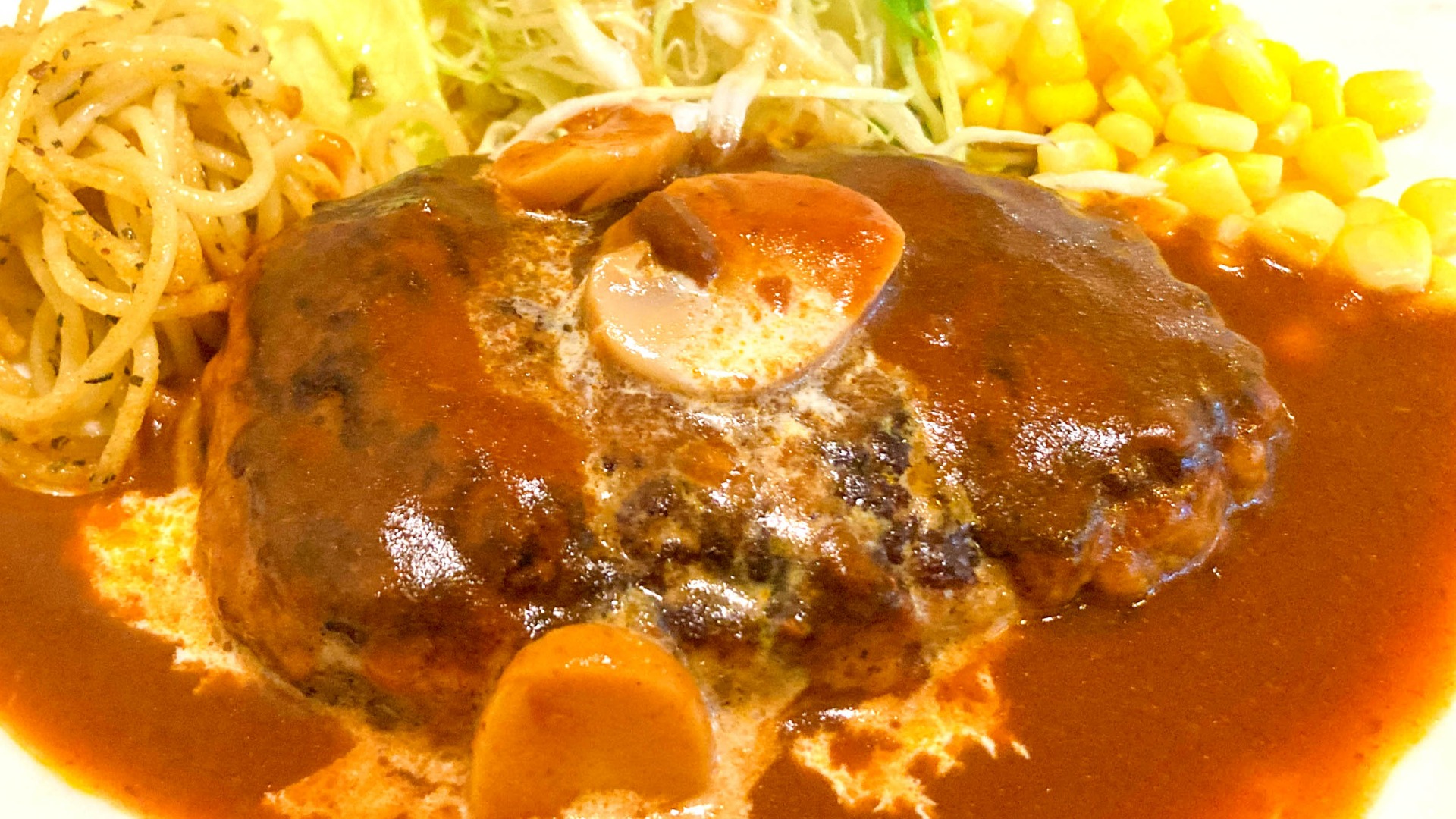 デミソースハンバーグ、パスタ、サラダ、コーンと、全体のバランスが絶妙で、五感を存分に楽しませることができました。